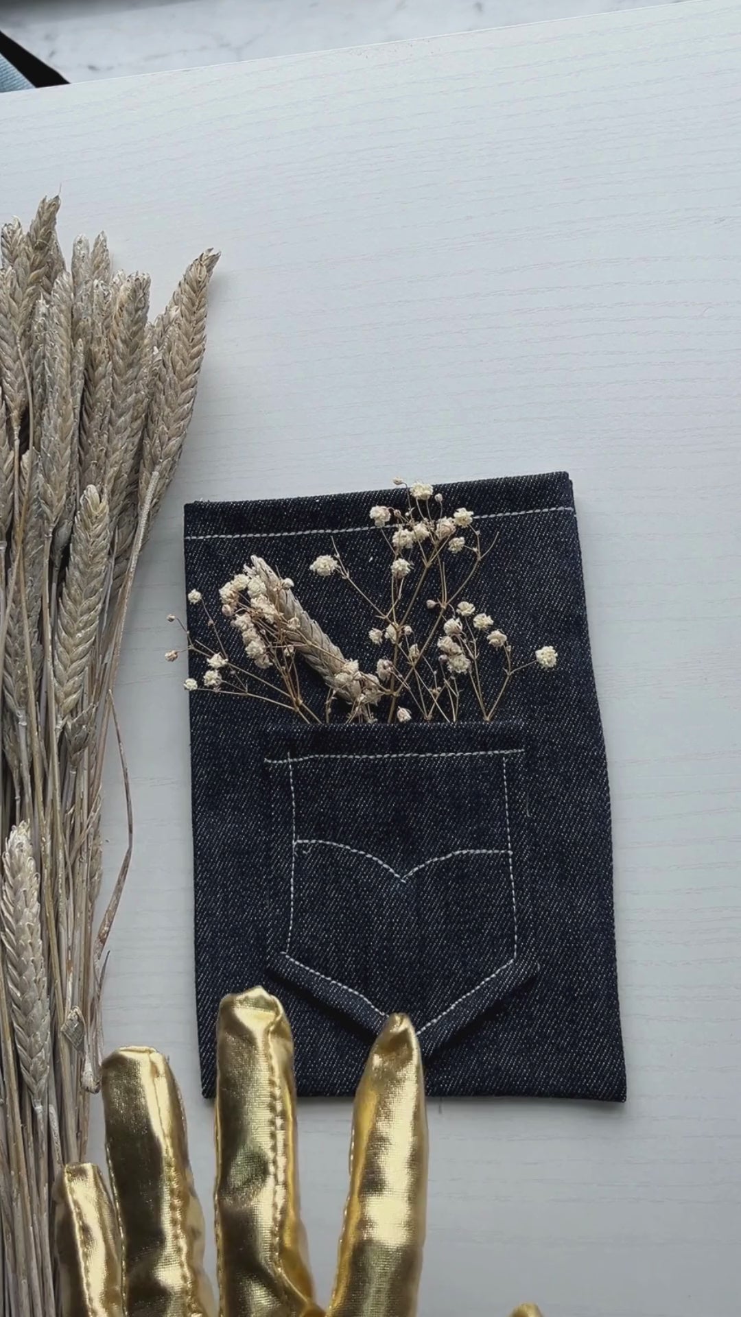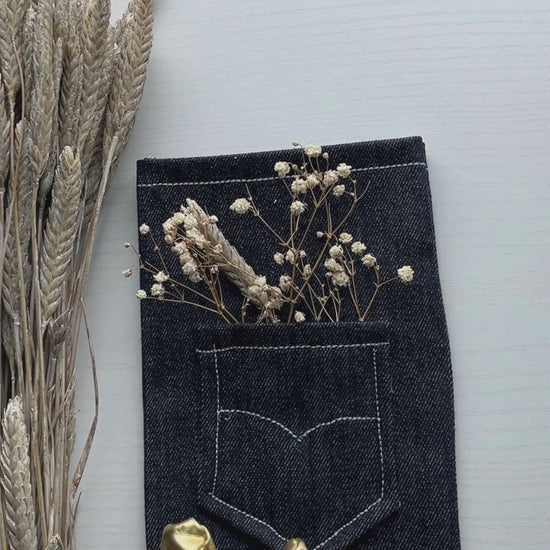 Carta personalizada de 5x7 pulgadas hecha a mano con sobre de bolsillo de tela vaquera (denim-mahon) y detalle floral seco.