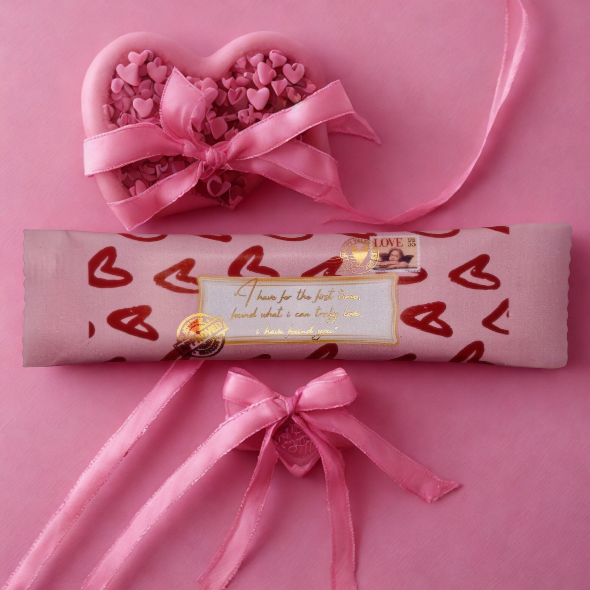 This unique, personalized chocolate bar wrapper captures a deeply romantic sentiment with its elegant design. The pink packaging features scattered red heart outlines and includes a customizable label centered on the front. This label highlights a meaningful quote often attributed to Charlotte Brontë's novel Jane Eyre: "I have for the first time found what I can truly love. I have found you."