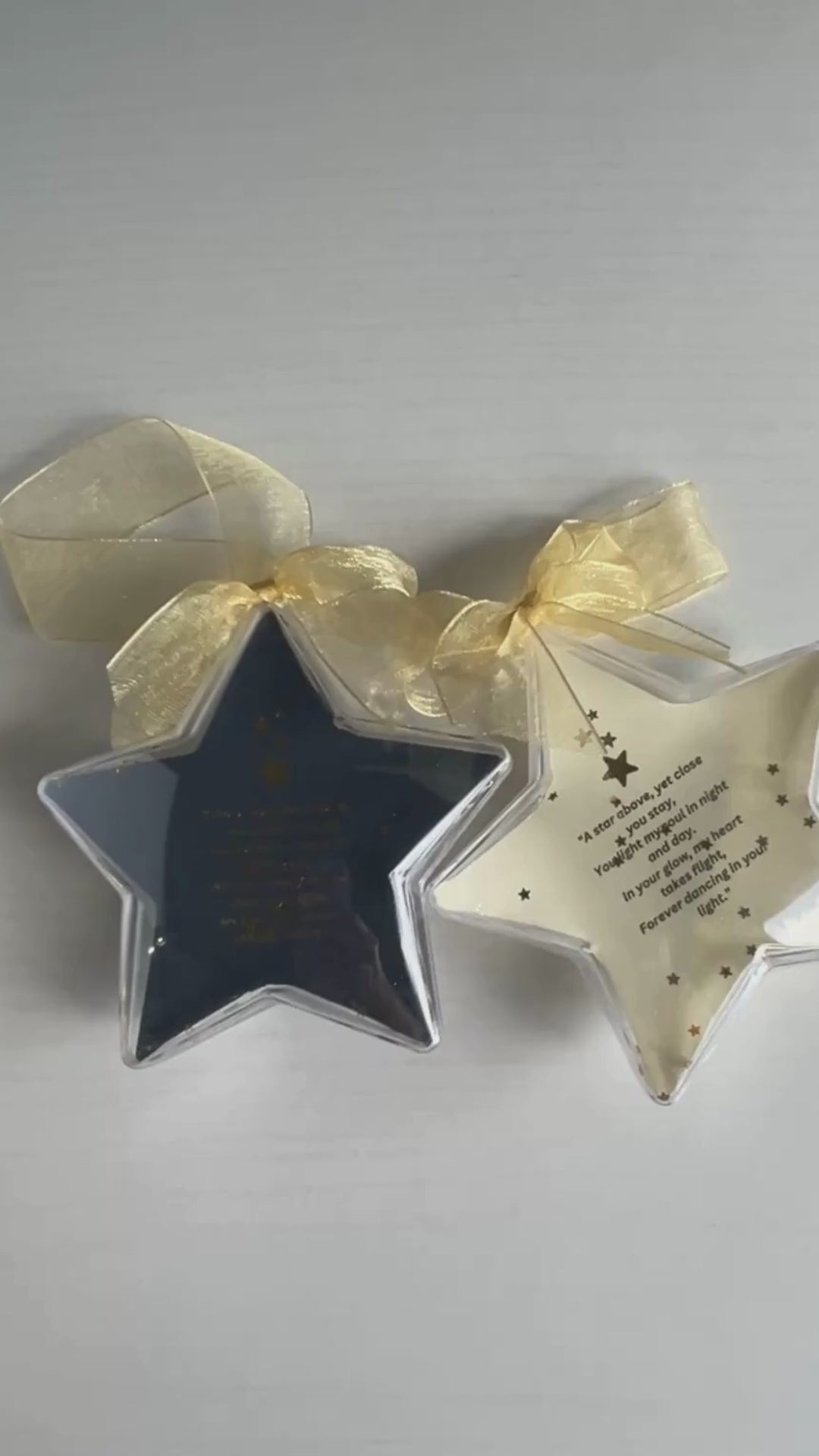 A primera vista, la carta viene en un adorno transparente con forma de estrella, adornado con un lazo dorado brillante, listo para colgar en cualquier lugar: en un árbol de Navidad, una ventana o incluso como decoración durante todo el año. En su interior flotan estrellas doradas brillantes que se mueven con gracia con cada toque, dándole brillo y vida.