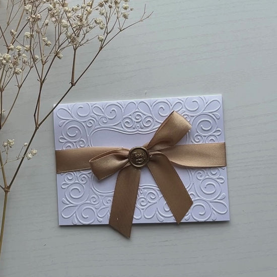 Una elegante tarjeta de agradecimiento en relieve blanca de 4 x 6, adornada con una cinta dorada satinada y un pequeño sello de lacre para un toque atemporal y sincero.