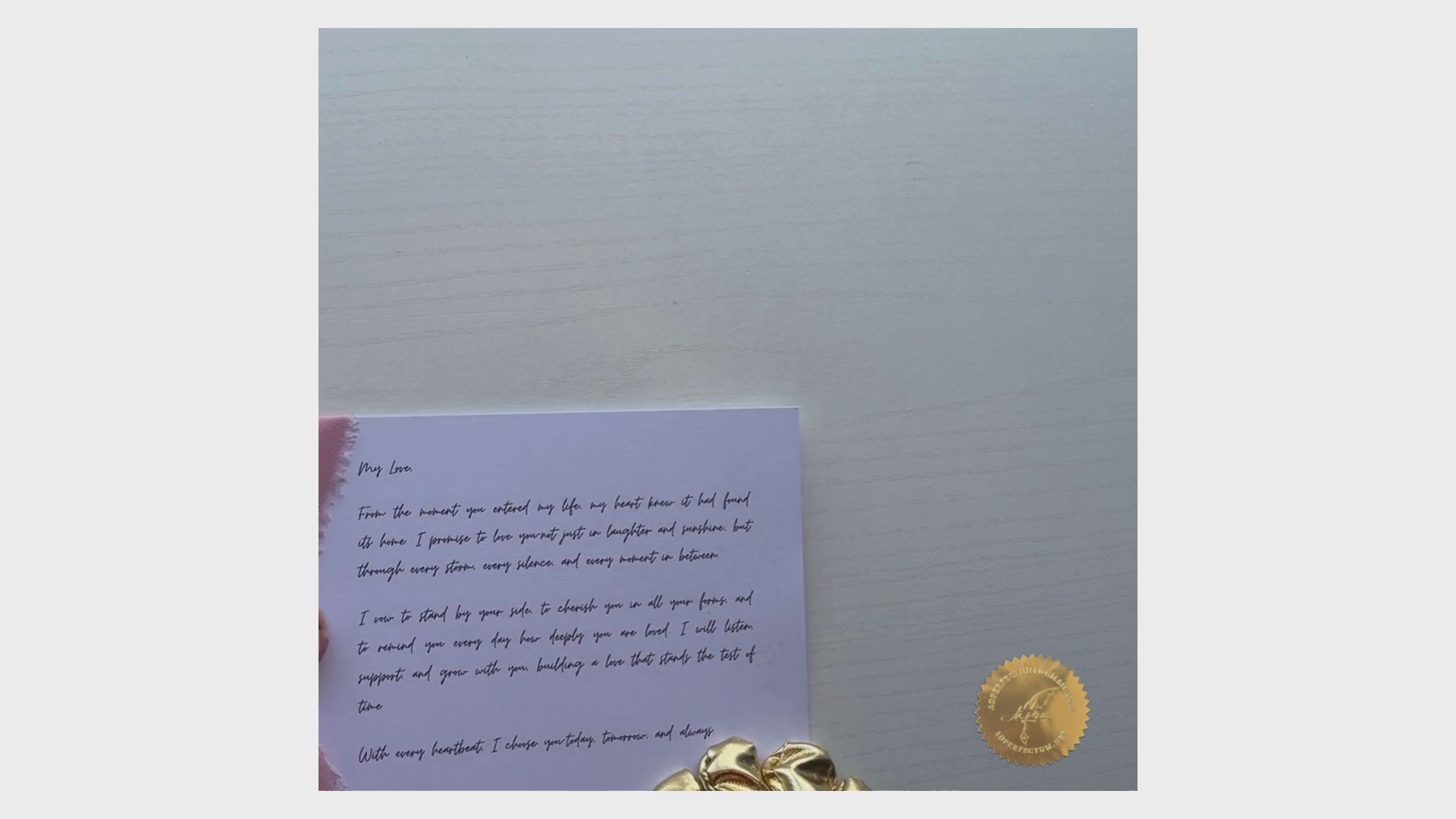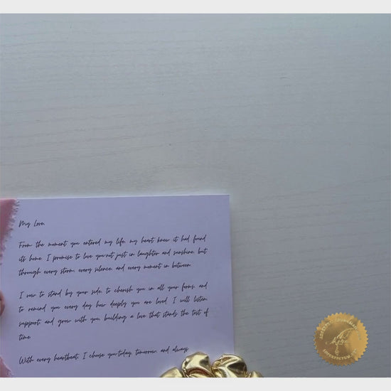 This is a romantic 5 x 7 love letter card designed with soft elegance and a heartfelt touch. The clean white card is beautifully accented with a wide, textured blush pink ribbon tied in a bow along the left side, creating a graceful and tender aesthetic. At the center of the bow rests a rose-gold wax seal stamped with the word “Love”, adding a timeless and classic charm.