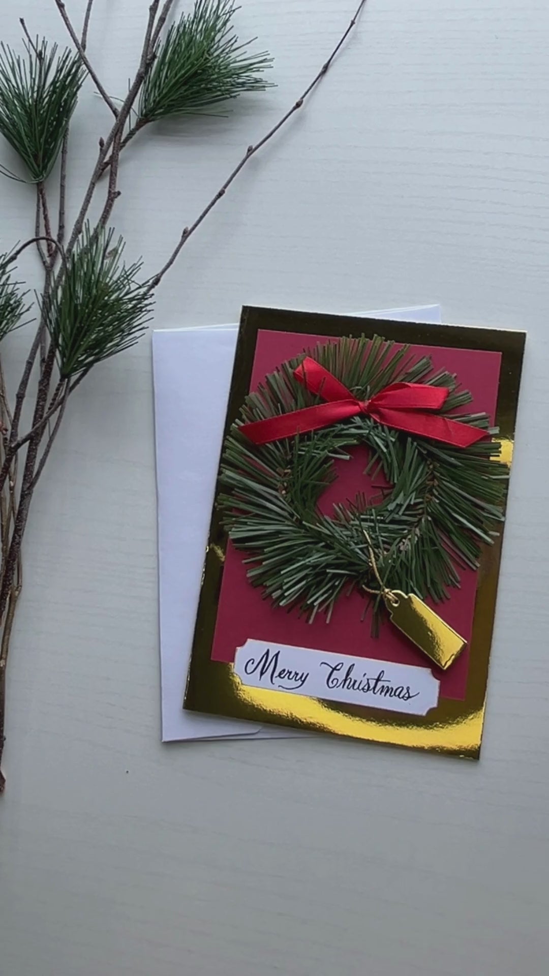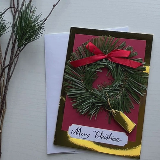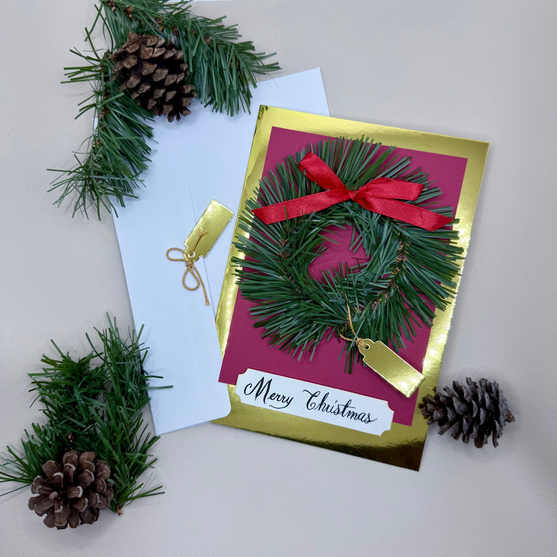 - The card design features a striking 3D Christmas wreath crafted with realistic green pine needles, tied with a bright red ribbon bow that adds warmth and tradition.