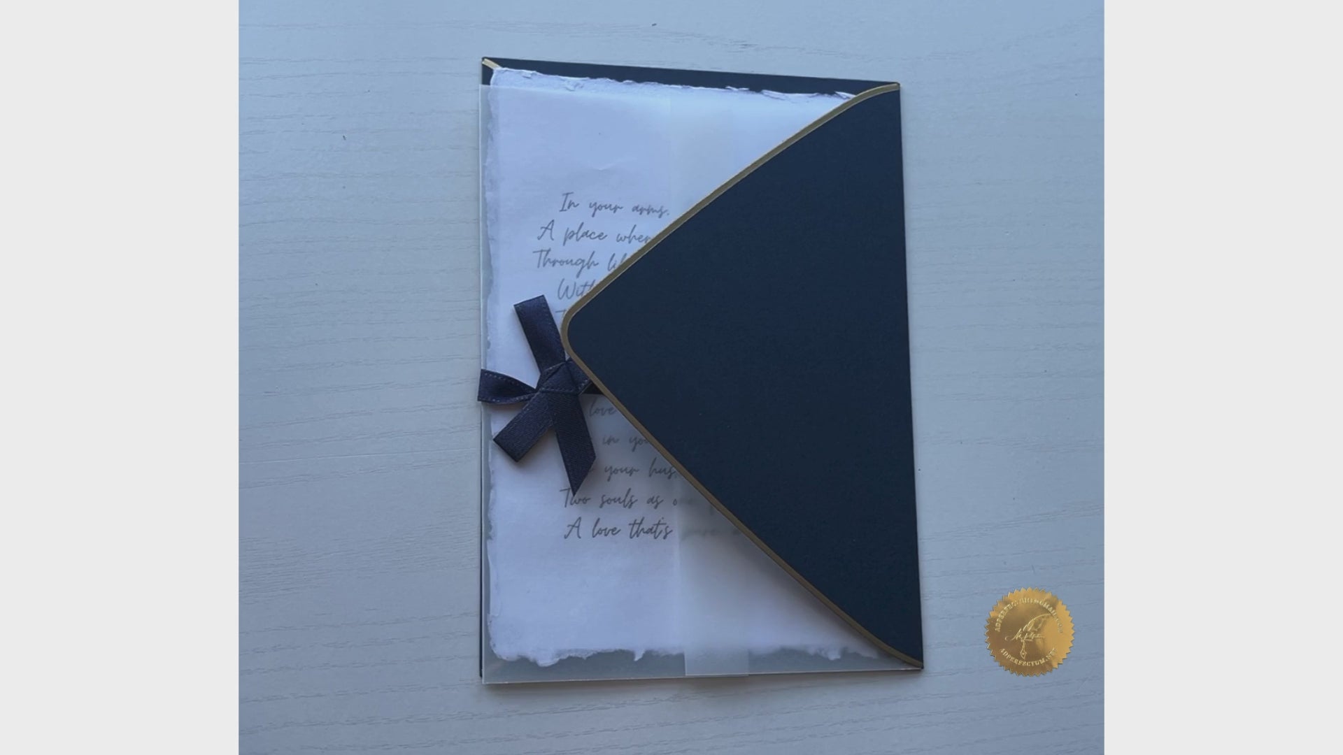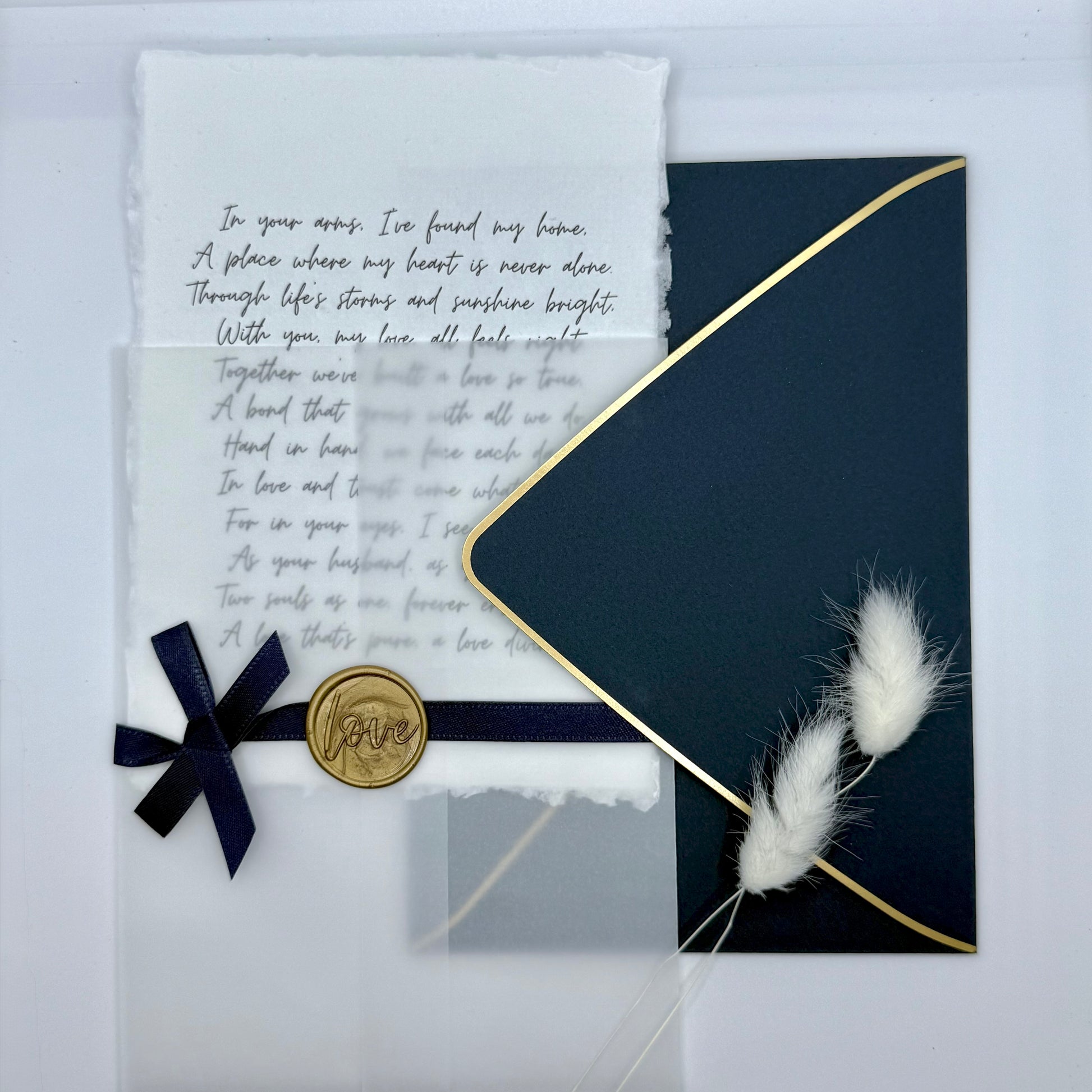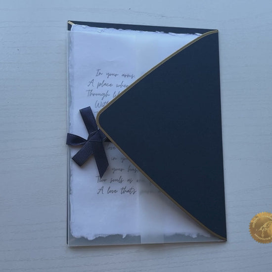 Crafted on recycled paper, layered with delicate vellum, and sealed with a navy ribbon, this heartfelt piece is meant to carry the deepest emotions—softly spoken, like whispers under the moonlight.