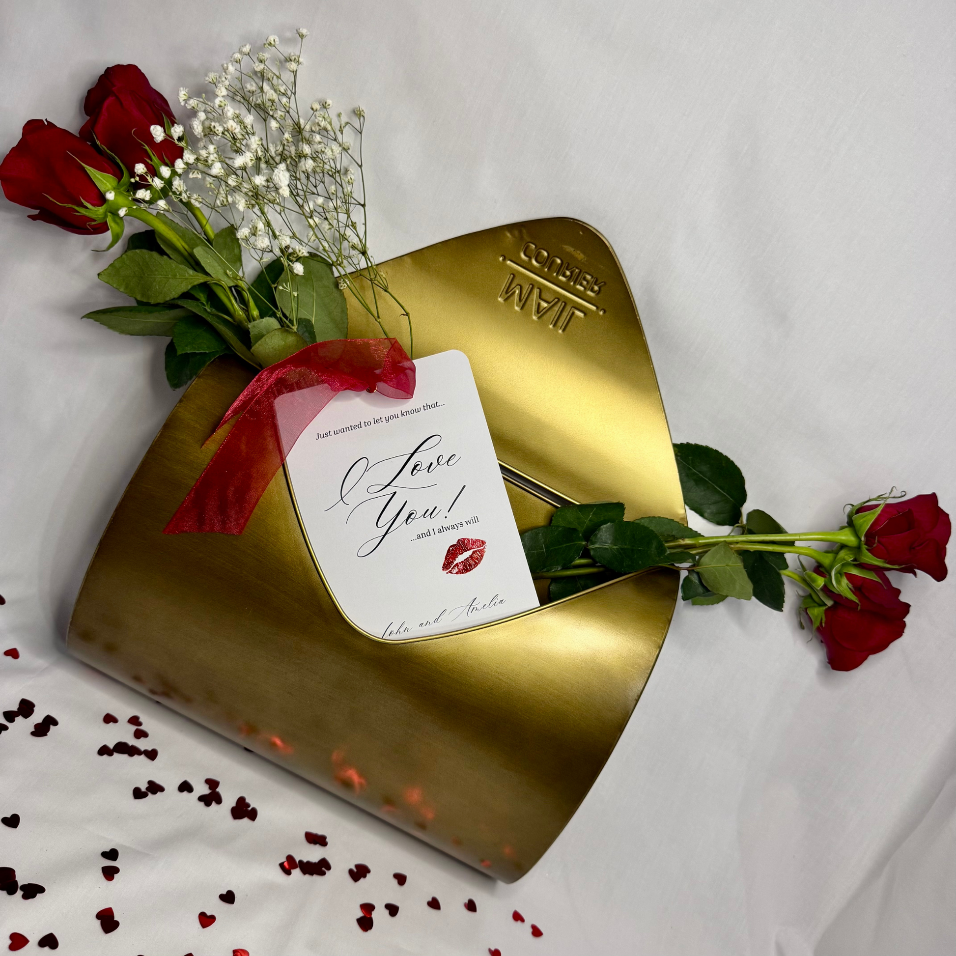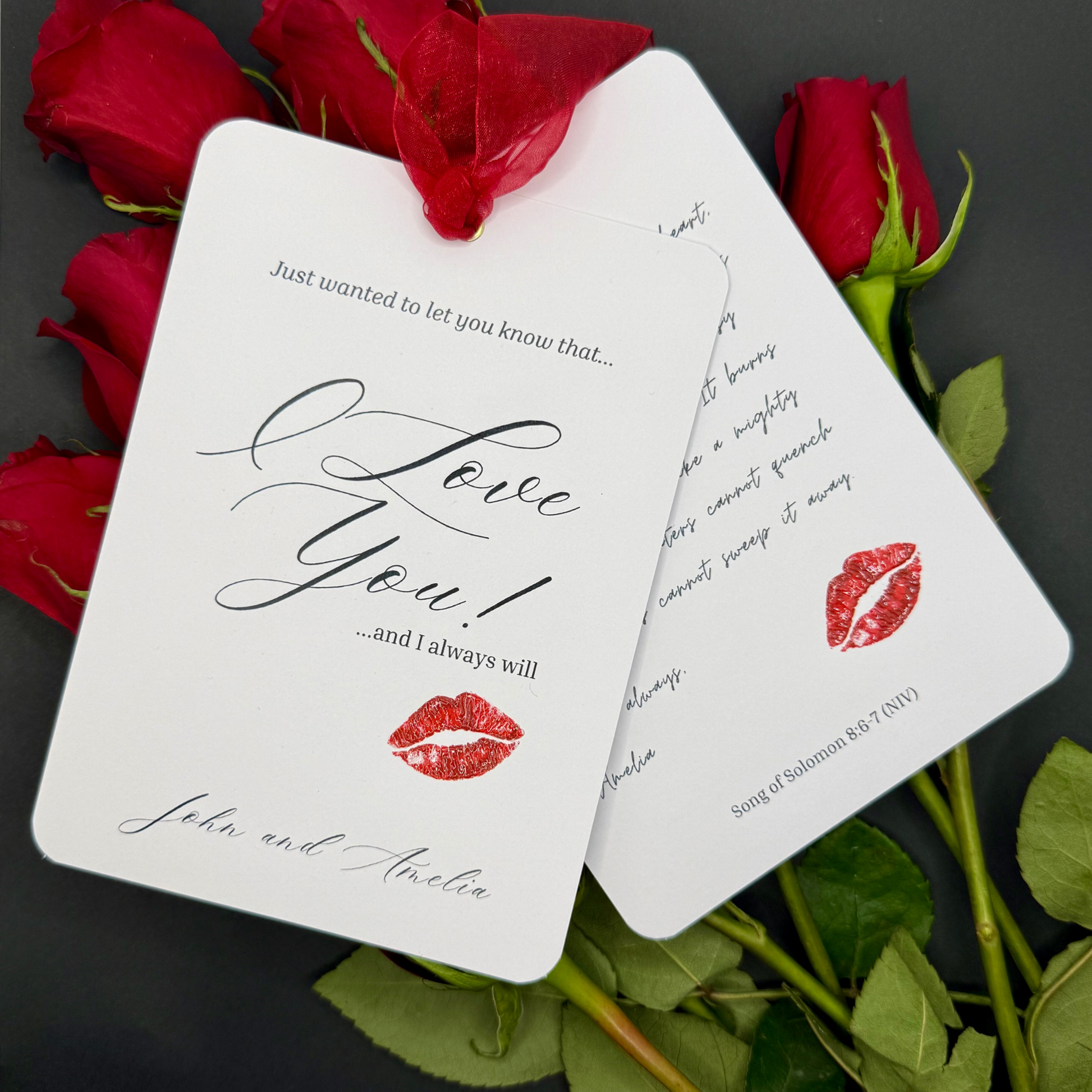 The front showcases graceful calligraphy with the phrase “I Love You… and I always will,” accented with delicate lipstick kiss details for a bold romantic touch. Each letter is personalized with names, making it a truly one-of-a-kind gift. A sheer red ribbon ties the cards together, adding movement, elegance, and a classic symbol of love.