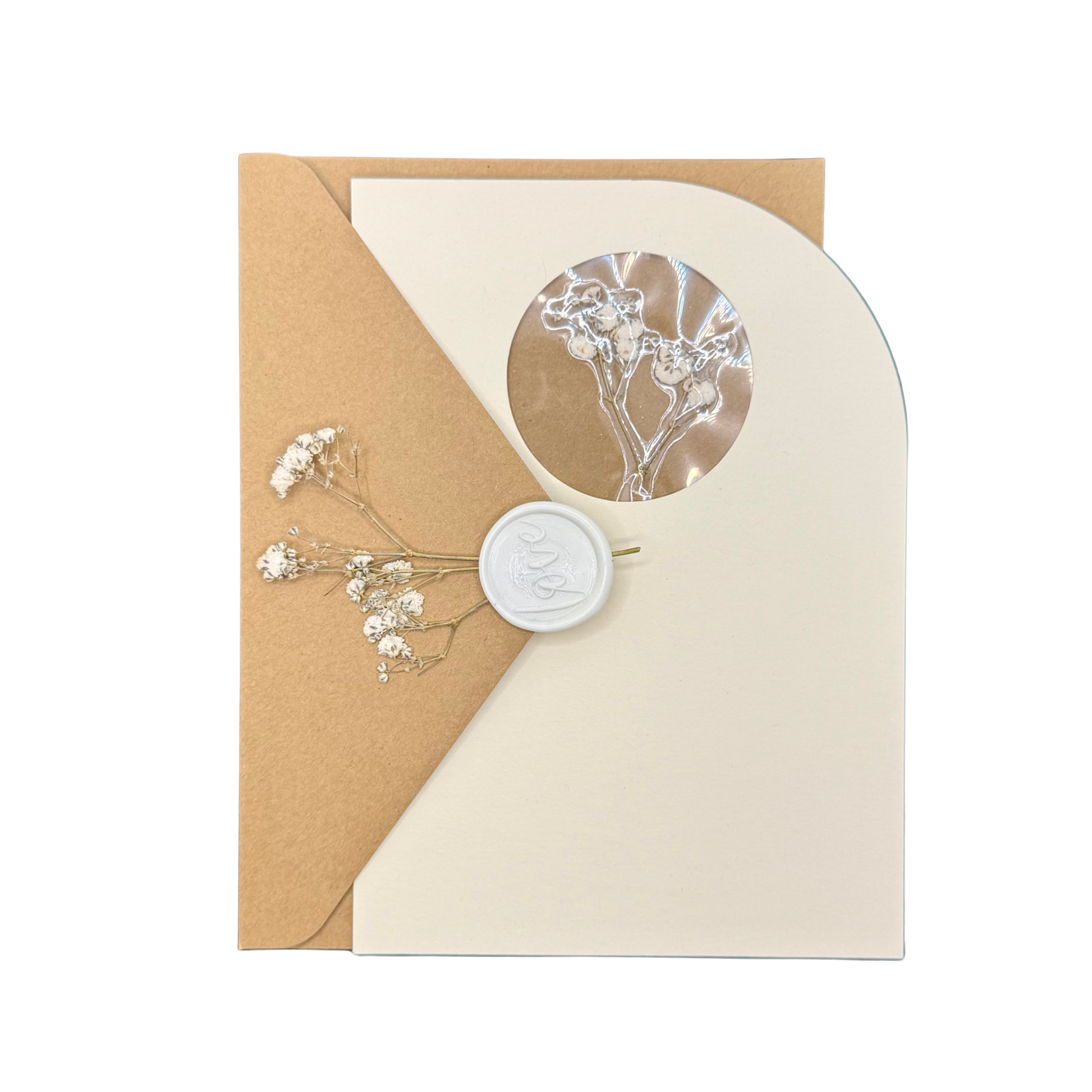 - Color: Ivory card, natural kraft brown envelope, white accents.